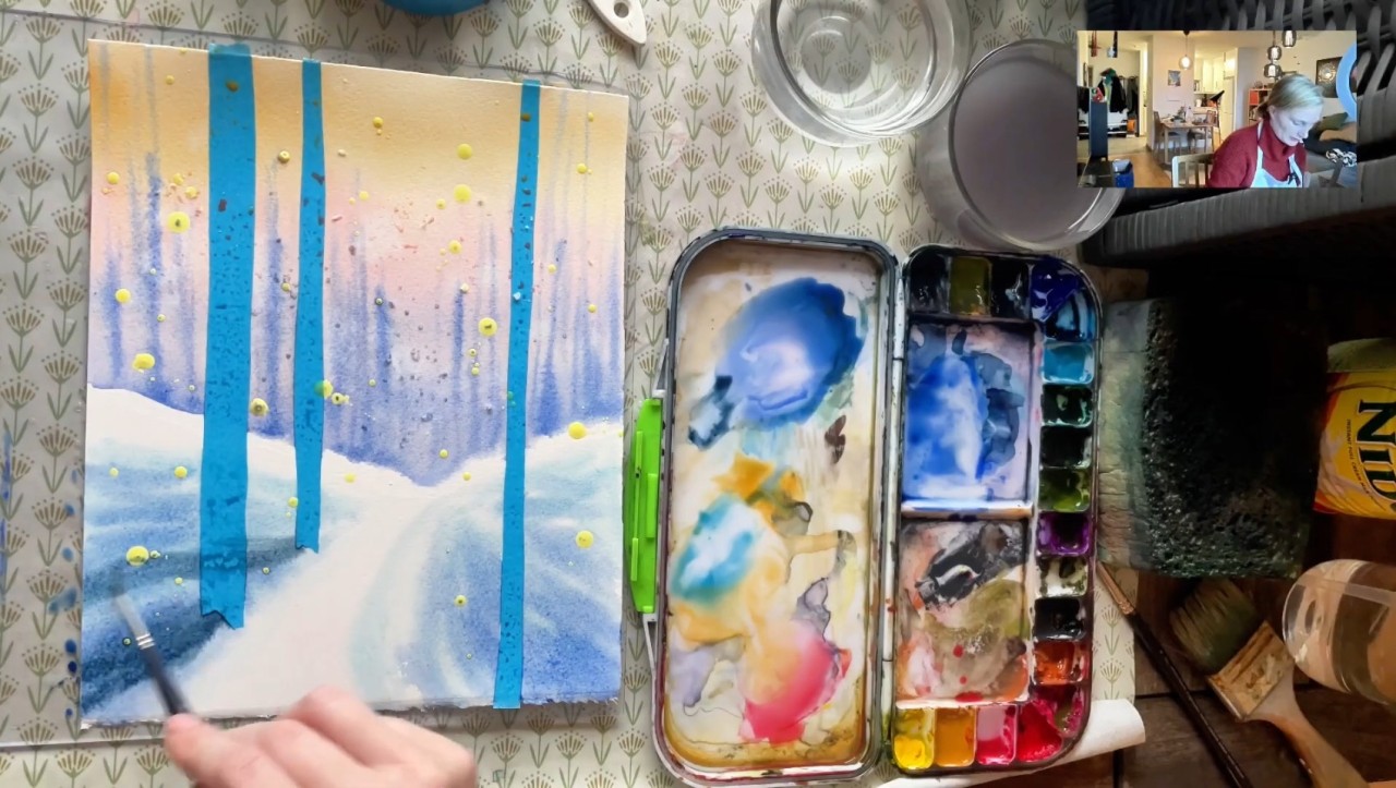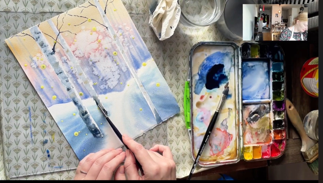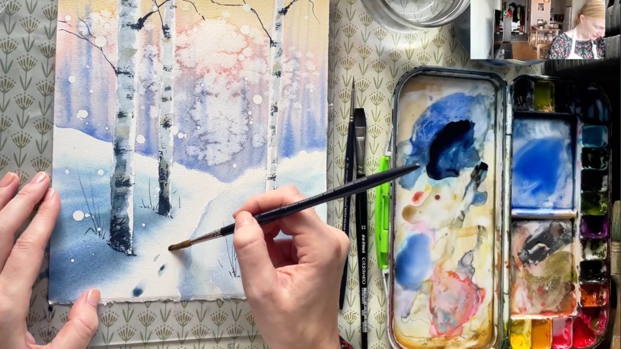 Skapa magiska vinterlandskap med björkar i akvarell.